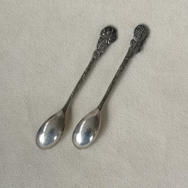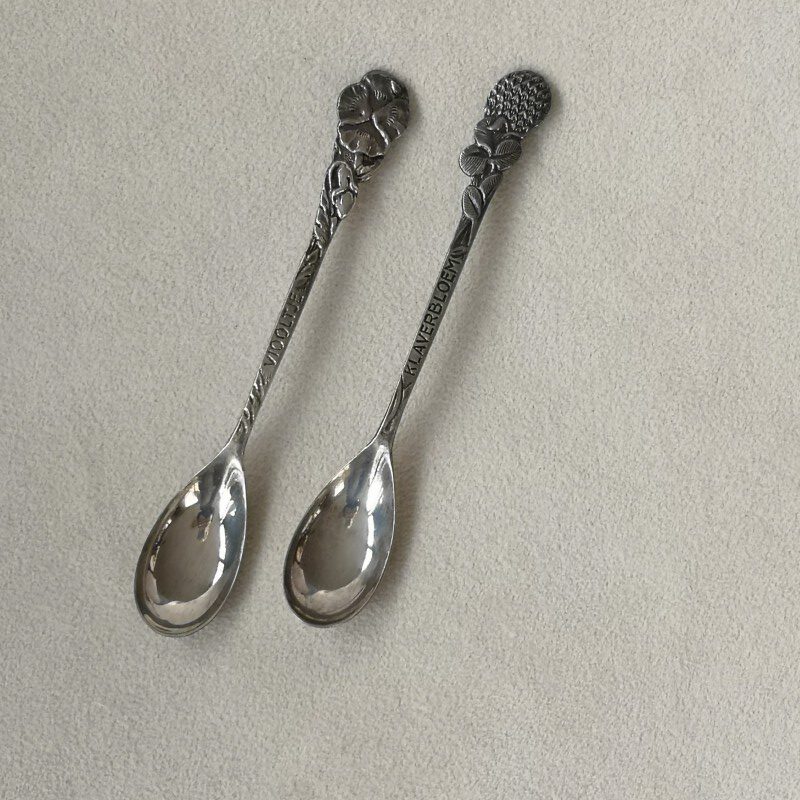 Vintage verzilverde theelepeltjes H. Hooijkaas Douwe Egberts bloemen 2 stuks