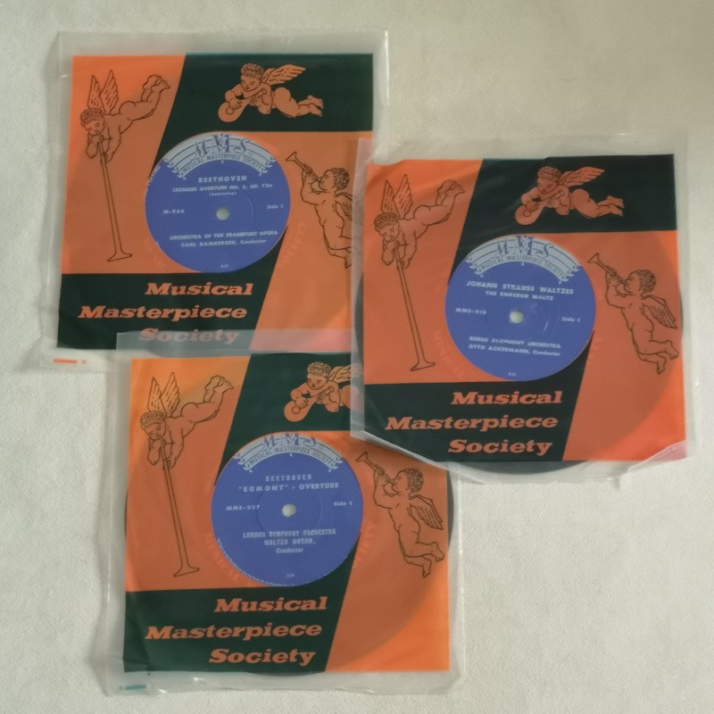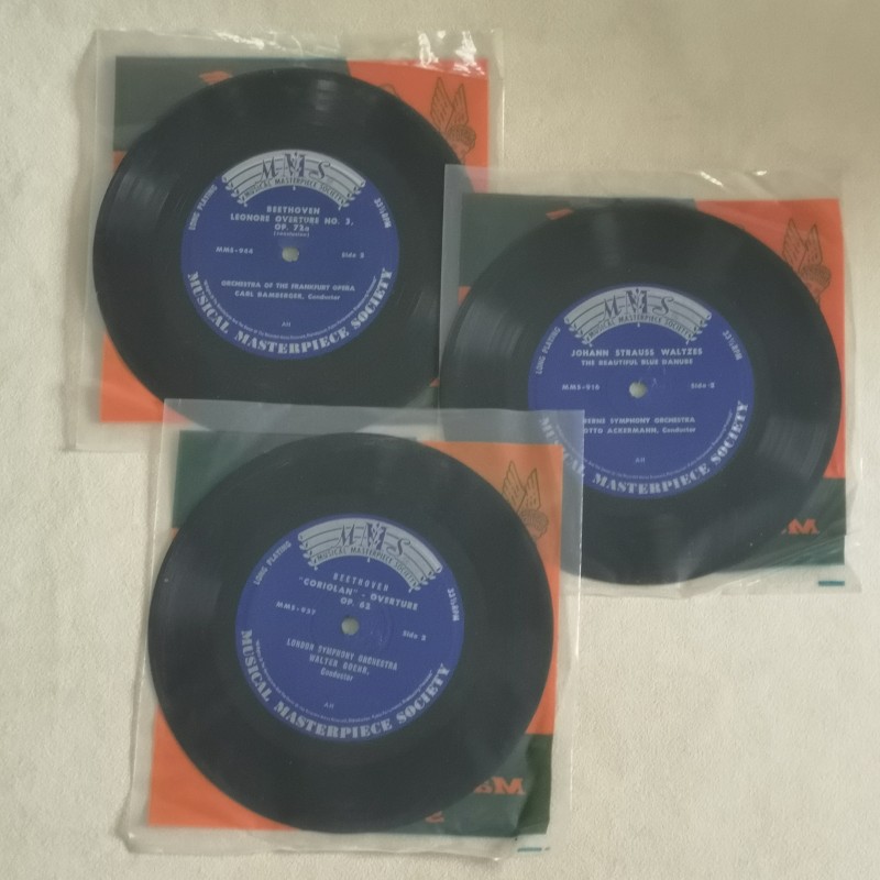 Vintage vinyl singles Musical Masterpiece Society; Johann Strauss Walzes, Beethoven ‘Coriolan’-Overture en Leonore Overture,