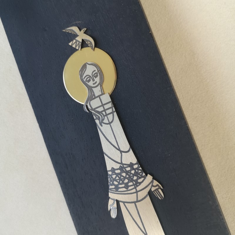 Werkelijk prachtige wanddecoratie gemaakt van hout (zwart gemaakt) met daarop, zeer fijntjes, van metaal Maria en de vredesduif. Het merkteken is er vanaf (je ziet nog wel waar het heeft gezeten) van de monniken van de Emaus workshop van Talleres Monasticos in Quernavaca Mexico. In een hele goede vintage staat; hele lichte gebruikerssporen mn op het hout.
