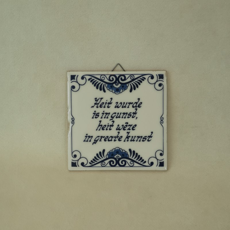 Delft Blauw wandtegeltje met spreuk in het Fries; Heit wurde is in gunst, heit weze in greate kunst. Aan een zijkant is ie niet helemaal goed geglazuurd (zie foto) verder in een hele goede vintage staat.