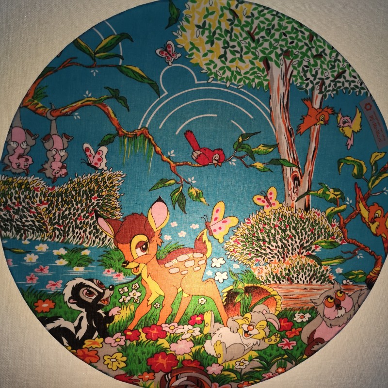 Schattige ronde wandlamp voorzien van een vrolijke vintage stof met Bambi en o.a. zijn vriendjes Stampertje en Bloem. Handgemaakt (en dus uniek) van een katoenen stof. Super leuk voor in de kinderkamer. Makkelijk op te hangen en voorzien van een kleine fitting en een lang snoer met knipschakelaar, helemaal compleet dus!