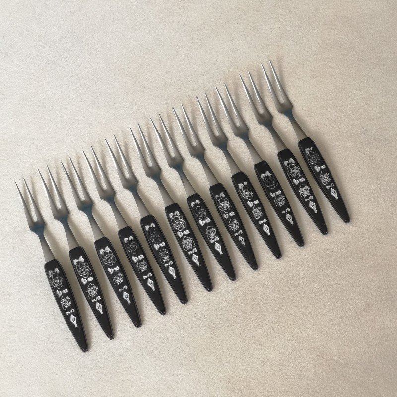 Leuke set van 12 cocktailprikkers / mini vorkjes gemaakt van roestvrij staal met een zwart kunststof heft gedecoreerd met een leuke opdruk. De opdruk is bij sommige wat versleten (zie foto) maar verder in een goede vintage staat.