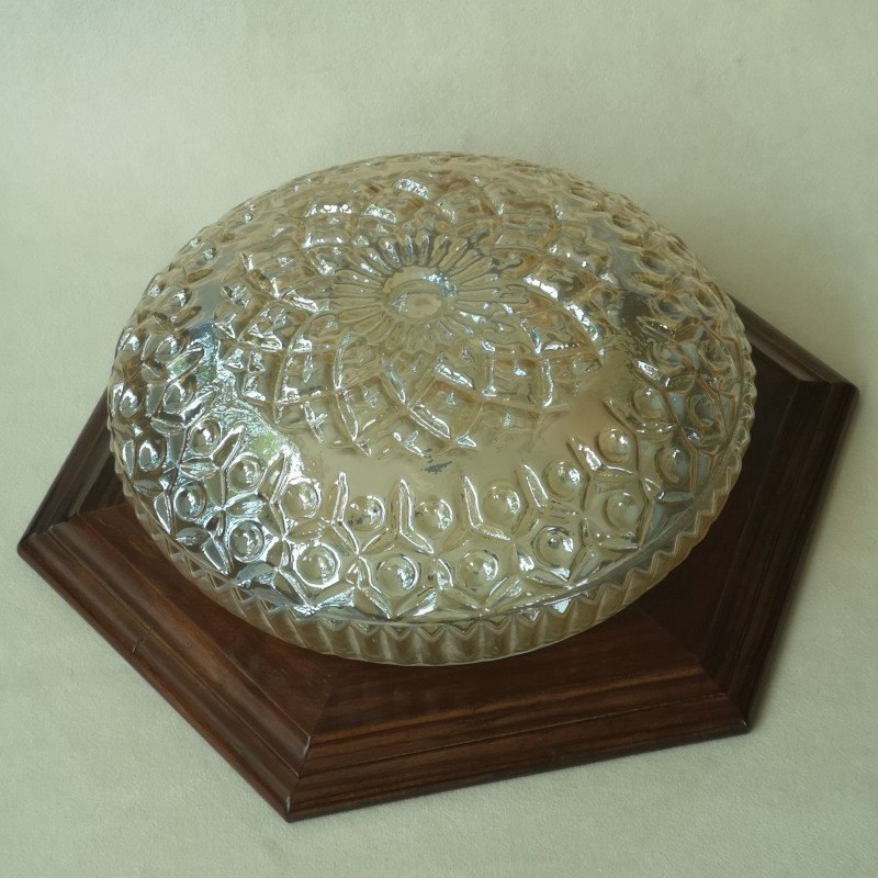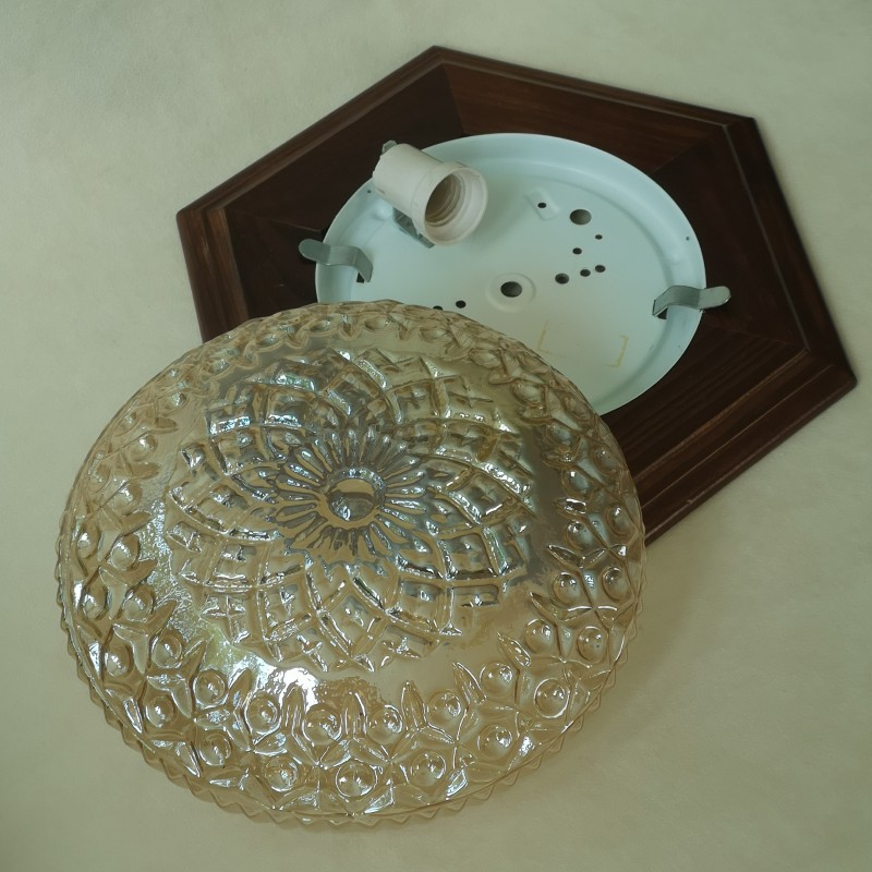 Vintage glazen plafondlamp / plafonnière hout met glazen kap rond zalmkleurig bloem