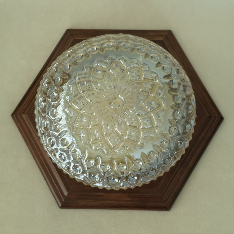 Afmetingen ca.: H 11, glas D 24cm, hout 29 x 33,5cm