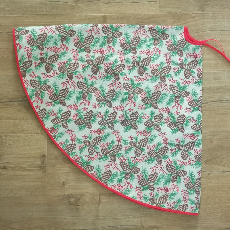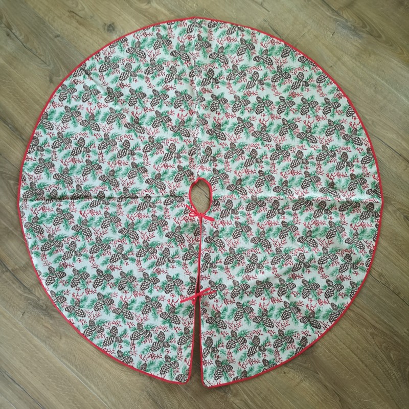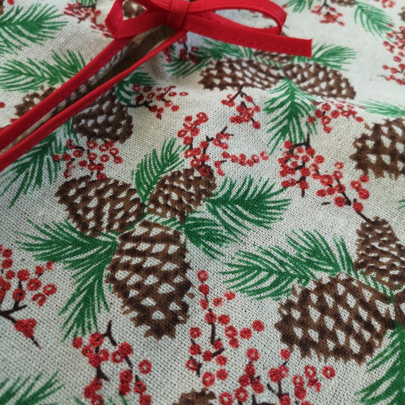 Prachtige kerstboomrok gemaakt van een linnenstof en voorzien van een dennentakjes met dennenappels en rode besjes in glitters print en mooi afgewerkt met een rode bies. Waarschijnlijk nooit gebruikt want nog in nieuwstaat.