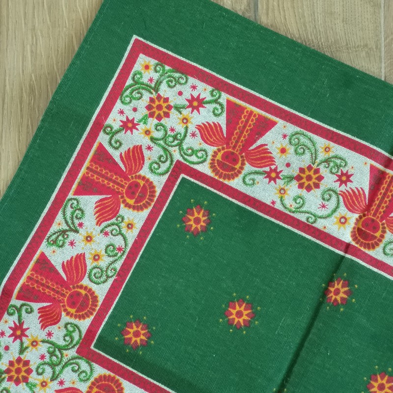 Deze mooie kerstloper is gemaakt door het Deense Sodahl van een linnenstof versierd met engeltjes in de kleuren groen, rood en geel. In een goede vintage staat; paar hele lichtje plekjes welke amper te zien zijn (zie foto).