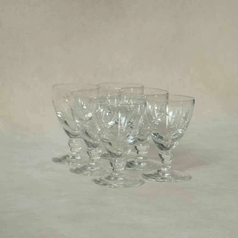 Set van 6 chique geslepen kristallen likeurglaasjes gemaakt door de Kristaluni Maastricht Holland, met sterretjes en kruisjes rondom. In een uitmuntende vintage/antieke staat. Leuk te combineren met de andere glazen uit dezelfde collectie die je ook in de webshop vindt.