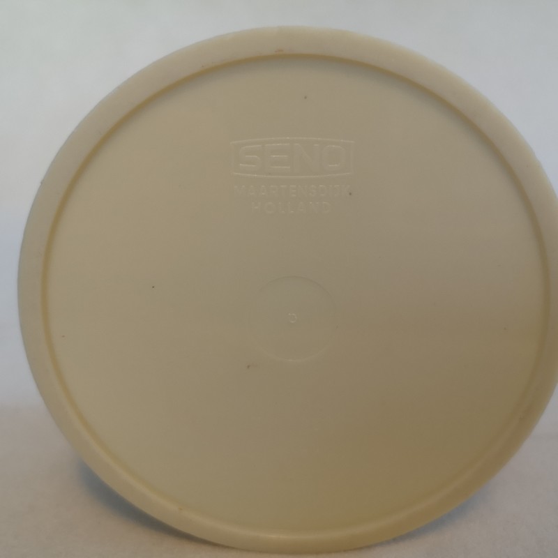 Dit kunststof voorraadpotje in crème met bruine deksel is gemaakt door Seno Maartensdijk Holland. Het heeft een super leuke opdruk in zwart en oranje van 2 kindjes die samen in een bed liggen met de tekst; die slapen onder dezelfde deken krijgen dezelfde streken. In een redelijk goede vintage staat; lichte gebruikerssporen (zie foto).