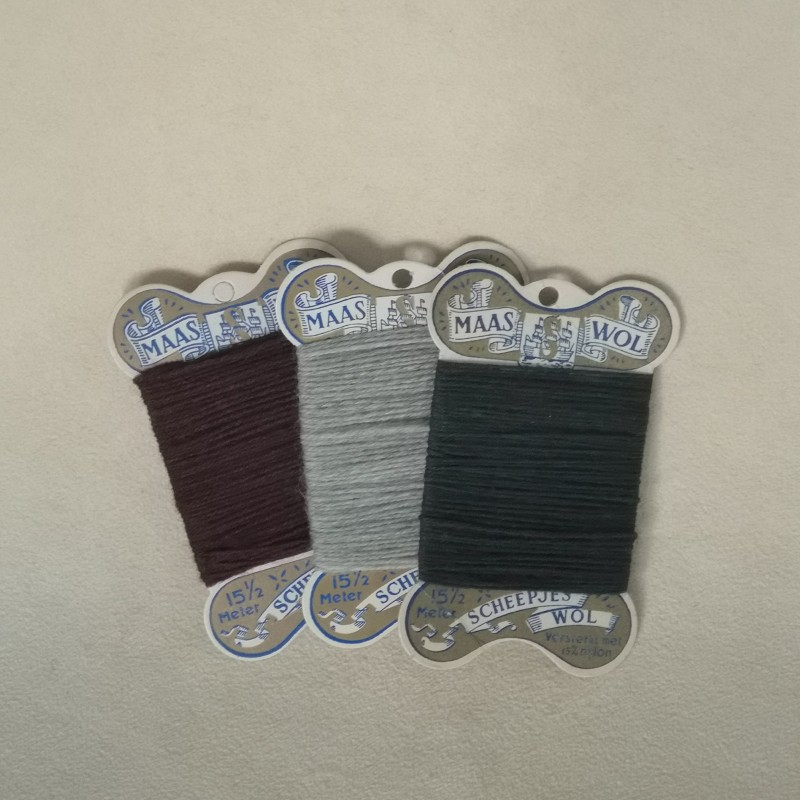 Set van 3 fourniturenkaartjes maaswol of stopwol van Scheepjeswol in verschillende kleuren gemaakt van wol versterkt met 15% nylon. Leuk als nostalgische decoratie bij een oude naaimachine bijvoorbeeld of je kunt er je sokken mee stoppen :-).
