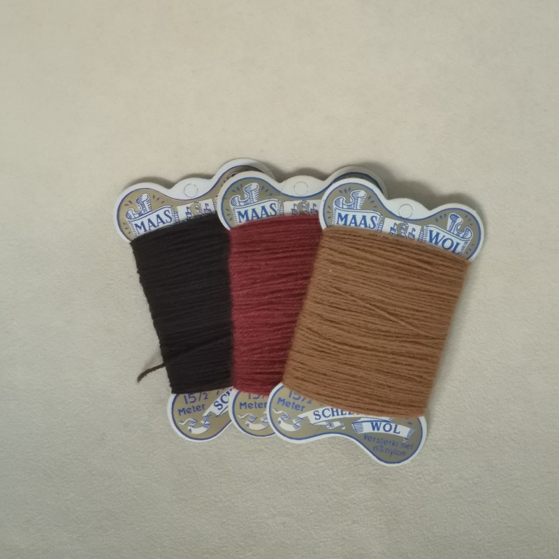 Set van 3 fourniturenkaartjes maaswol of stopwol van Scheepjeswol in bruintinten gemaakt van wol versterkt met 15% nylon. Leuk als nostalgische decoratie bij een oude naaimachine bijvoorbeeld of je kunt er je sokken mee stoppen :-).