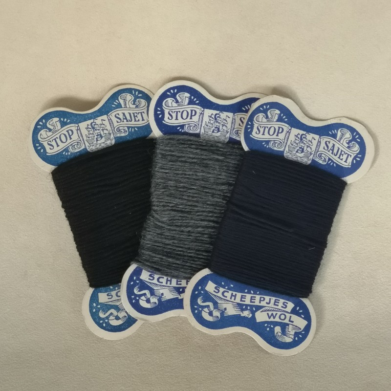 Set van 3 grote fourniturenkaarten maaswol of stopwol van Scheepjeswol in de kleuren zwart, grijs en blauw gemaakt van wol. Leuk als nostalgische decoratie bij een oude naaimachine bijvoorbeeld of je kunt er je sokken mee stoppen :-).