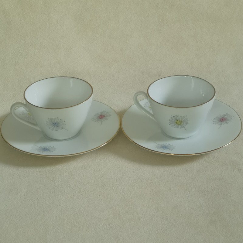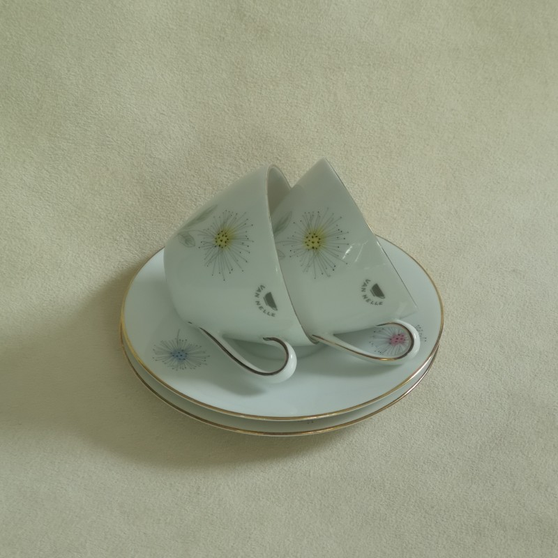 Schattige set van 2 porselein kop en schotels voor een demitasse of espresso. Gemaakt door Seltmann Weiden Bavaria i.o.v. Van Nelle. Op het schoteltje en het kopje staan leuke afbeelding en diverse kleurtjes en verder zijn ze voorzien van chique gouden randjes. In een hele goede vintage staat, ook de gouden randjes zijn nog netjes.