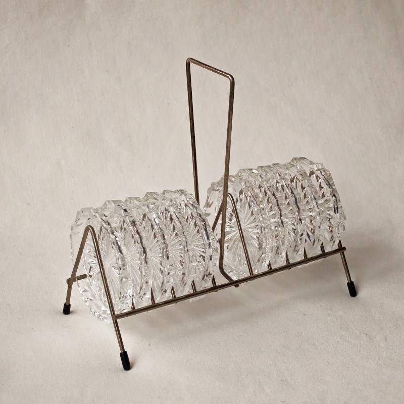 Super leuk metalen rekje met zwarte dopjes voorzien van 10 onderzetters oftewel kelkebakjes met mooi kristal geslepen patroon. In een goede vintage staat; het rekje heeft wat leeftijdssporen, de onderzetters zijn zo goed als nieuw.