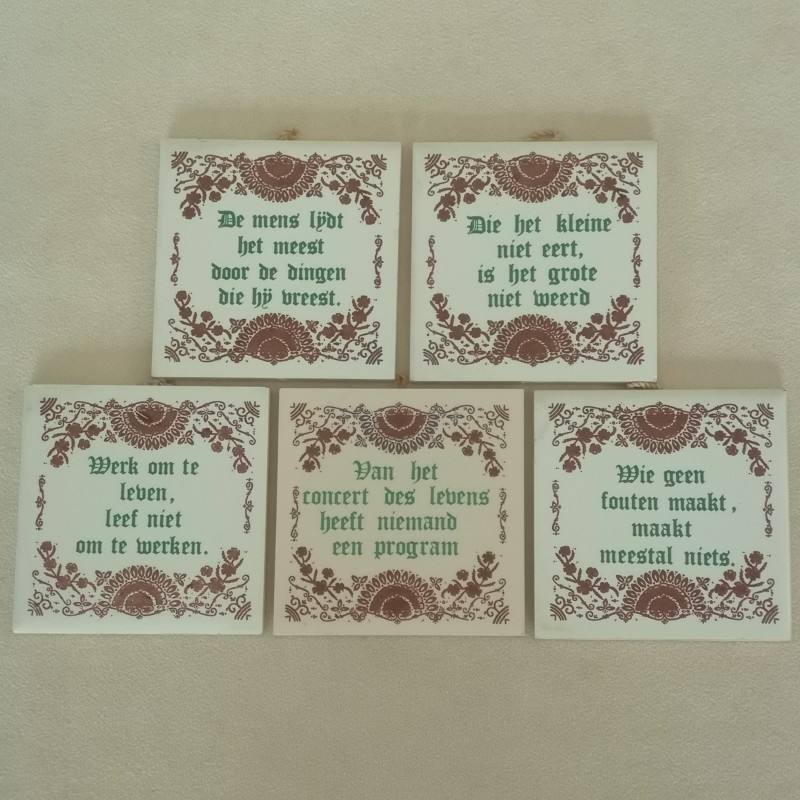 Leuke kleine spreuktegeltjes voor aan de wand (met ophanglusje), keuze uit 5 verschillende; 1) De mens lijdt het meest door de dingen die hij vreest. 2) Werk om te leven, leef niet om te werken. 3) Die het kleine niet eert, is het grote niet weerd. 4) Wie geen fouten maakt, maakt meestal niets. 5) Van het concert des levens heeft niemand een program. Prijs is per stuk. Geef je in de opmerkingen even aan welk(e) tegeltje(s) je wilt bestellen?